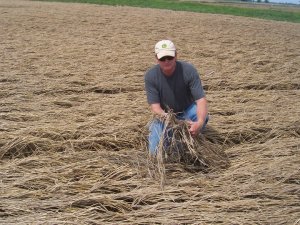 While interviewing Bob about his tour of the Bird’s Point levee, he shared nearly 100 photos he had taken of the area. In one picture, a man is bent down over flattened wheat. “About 10 percent of this land was in wheat that was ready for harvest when they blew the levee,” says Bob. “The problem is that this wheat was laid down and cannot be tilled under because the equipment just gets tangled and it’s impossible to get underneath the wheat to till the soil.”