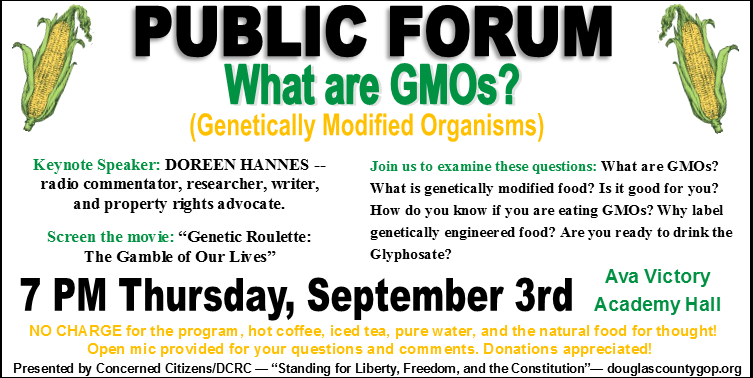 I’ll be speaking at a meeting in Ava next week about GMO’s and many of the issues and concerns surrounding these man made life forms. If you’re in the area, it would be great to see you there! Here’s the advertisement that has gone out to promote the event: